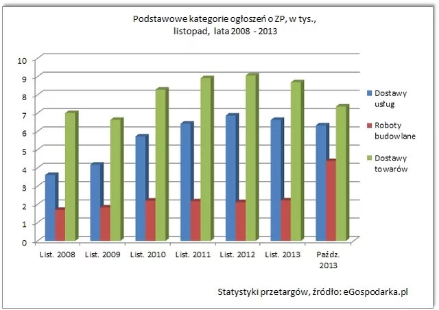 W relacji miesięcznej, w porównaniu z październikiem 2013, w listopadzie spadła jedynie liczba zamówień na prace budowlane (o 49,27 procent). Spadek ten jest jednak zjawiskiem typowo sezonowym, tak znaczne spadki występują bowiem cyklicznie od wielu lat i są spowodowane końcem sezonu budowlanego oraz początkiem zimy. W pozostałych dwóch analizowanych kategoriach, czyli dostawach towarów oraz dostawach usług, w listopadzie 2013 roku zanotowano miesięczny wzrost, odpowiednio o 17,99 proc. (dostawy towarów) oraz 4,66 procent (dostawy usług). Wzrost liczby zamówień w segmentach niebudowlanych pod koniec roku jest w sektorze publicznym również zjawiskiem sezonowym. Z jednej strony instytucje tego sektora wykorzystują pozostałe fundusze z bieżącego roku budżetowego (w przypadku ich niewykorzystania najczęściej środki te są zobowiązane zwrócić do organu założycielskiego), z drugiej zaś rozpoczynają procedury dostaw środków i usług na rok kolejny, niezbędnych do zapewnienia ciągłości działania.
